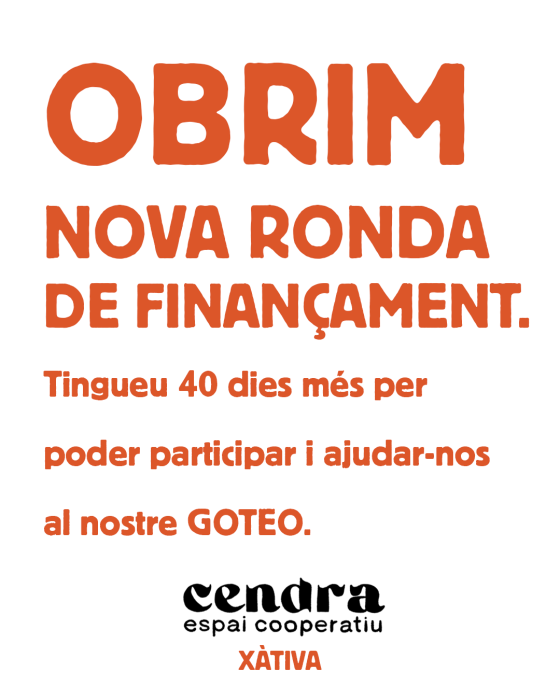Però no volem quedar-nos en 11.309€, volem arribar als 19.917€ i més enllà. és per això que hem obert una segona ronda de finançament de 40 dies. És important recordar que volem arribar a l’objectiu òptim per fer realitat tot el que hem projectat a Cendra Espai Cooperatiu.