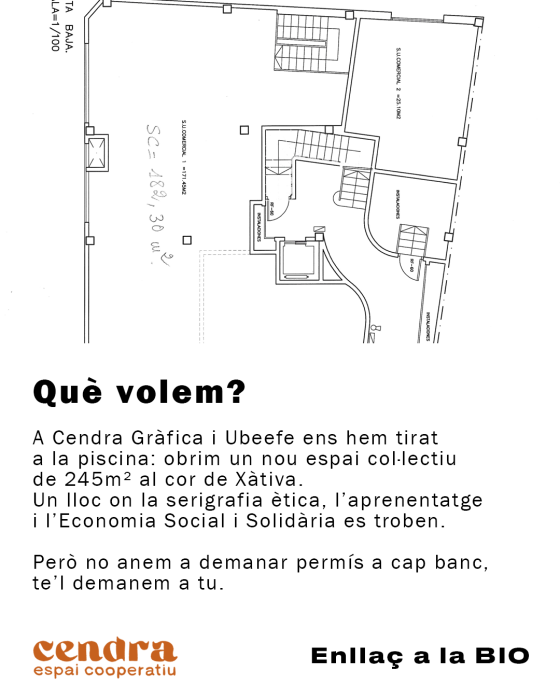 Serà el moment perfecte per ensenyar-vos en persona la distribució del local: des del taller de serigrafia a ple funcionament fins a l'espai social. Volem explicar-vos el projecte cara a cara, resoldre dubtes i, sobretot, donar-vos les gràcies personalment. Volem que ens aporteu les vostres idees. L'Espai també és vostre.