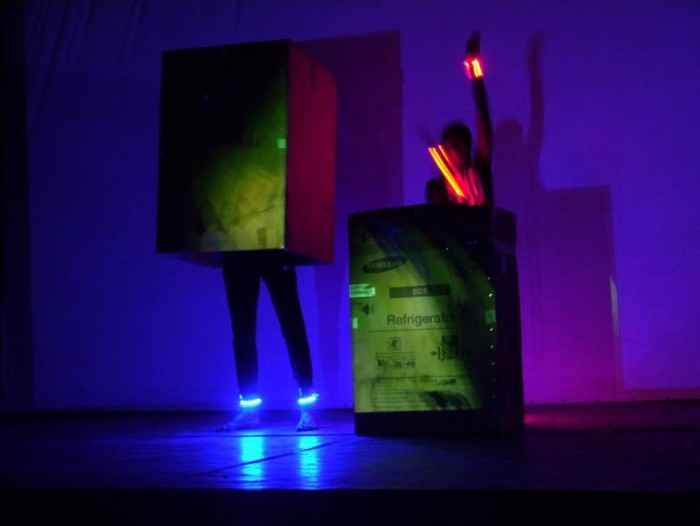 2. La performance "Double Faces", co-creada con Yassine Balbzioui, en la que trabajaron también los bailarines Alicia Gomis y Omar Thiandoum. Estos últimos portaban unas máscaras-cajas gigantescas y recorrían el espacio del público con ellas. Al entrar en escena, las cajas proyectaban lo que Yassine iba realizando en tiempo real en ese momento, de manera que si se juntaba formaban una única cara enorme y, si se separaban, representaban el rostro de Yassine en dos. Éste fue realizando un streap-tease invertido de rostro,poniendo y quitando objetos, máscaras, materiales variados y capas de pintura hasta llegar a un estado de delirio que se potenciazaba con Science Fiction de Coleman subiendo de volumen... www.youtube.com/watch?v=XwGJ5VxFjI8