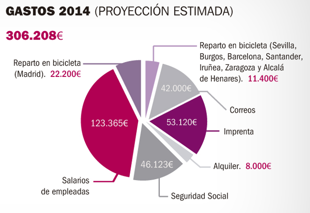 Además de esta deuda, este año 2014 estimamos que tendremos que hacer frente a gastos de 306.208 euros. Esto es lo que nos cuesta editar 24 números, de los que se imprimen 8.000 ejemplares y se distribuyen en kioscos de Madrid y más de 200 puntos en Europa, y mantener diariamente Diagonalperiódico.net, con un equipo que actualmente está compuesto por once personas empleadas. La cantidad excede mucho de lo marcado para el crowdfunding porque confiamos en que éste sea una inyección puntual, pero podamos seguir manteniendo un ritmo de ingresos constante durante el año gracias a nuevas suscripciones, ventas, publicidad, eventos, etc.